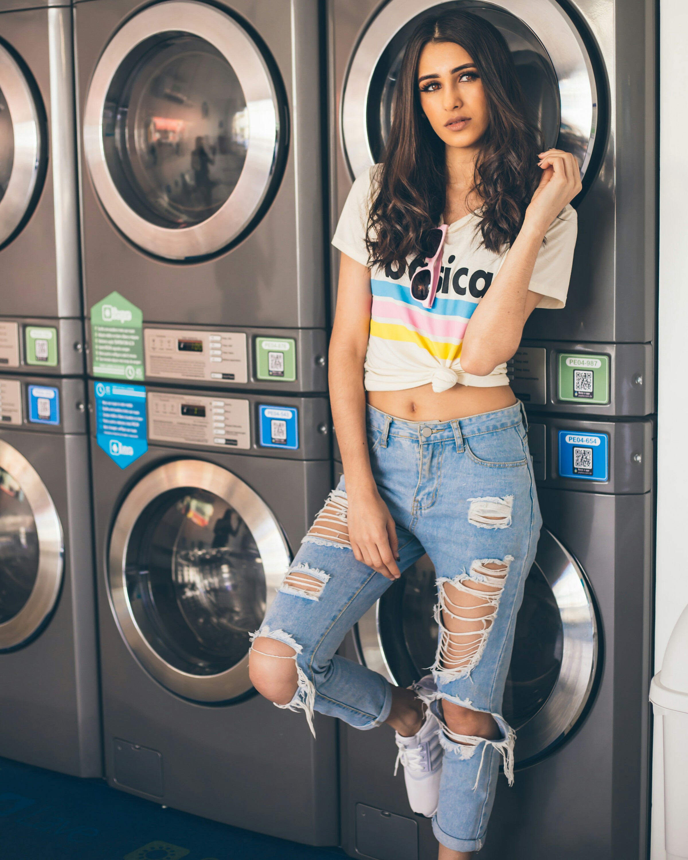 High – low skirts, also known as asymmetrical, waterfall, or mullet skirts, are skirts with a hem that is higher from the front, or side, than in the back. It is very trendy nowadays.